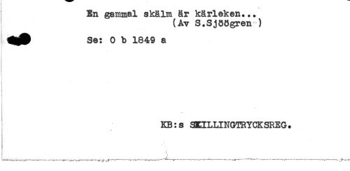 //// En gammal skälm är kärleken... //// (Av S.Sjöögren ) //// ^^ Se: O b 1849 a //// - //// % //// i' //// t //// i //// KB:s SKILLINGTRYCKSREG. //// . //// ( ////