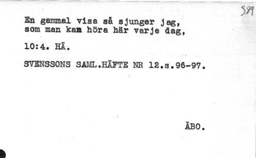 //// 3F? //// En gammal visa så sjunger jag, //// som man kam höra hår varje dag, //// 10:4. HA. //// SVENSSONS SAML .HÄFTE NR 12.s.96-97. //// ÅBO. ////