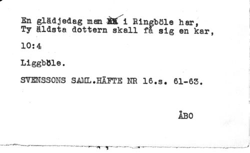 //// - I //// En glädjedag man Ringböle har, //// Ty äldsta dottern skall få sig en kar, //// 10:4 //// LiggbBle. //// SVENSSONS SAHL.HÄFTE NR 16.s. 61-63. //// < //// i //// : //// ÅBO //// ' - ^ ----'----....---.---- ////