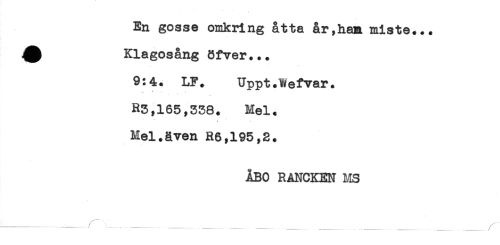 //// En gosse omkring åtta år,ham miste... //// ^ Klagosång 8fver... //// 9:4. LF. Uppt.lwefvar. //// R3,165,338. Mel. //// * * //// Mel.även R6,195,2. //// ÅBO RANCKEN MS //// / * ////