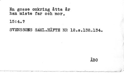 //// En gosse omkring åtta år //// han miste far och mor, //// 15:4.? //// SVENSSONS SAML.HÄFTE NR 12.s.132-134. //// i //// i //// ÅBO ////