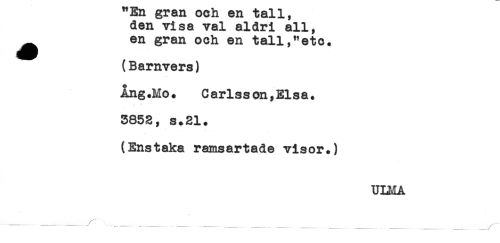 //// "En gran och en tall, //// den visa val aldri all, //// ^ en gran och en tall,"eto. //// (Barnvers) //// Ång.Ho. Carlsson,Elsa. //// 3852 <t s + 211* //// (Enstaka ramsartade visor.) //// ULMA //// yr \ ////