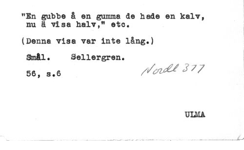 //// "En gubbe å en gumma de hade en kalv, //// nu ä visa halv," etc. //// (Denna visa var inte lång.) //// Smål. Sellergren. //// 56, ,.6 -- ^ //// ULMA ////