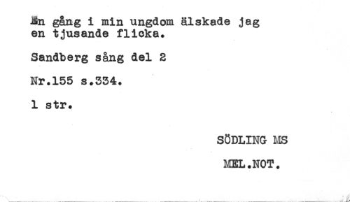 //// Bn gång i min ungdom älskade jag //// en tjusande flicka. //// Sandberg sång del 2 //// Nr.155 s.334. //// 1 str. //// SÖDLING MS //// MEL.NOT. //// \--- . _____.... . . -----. ---.....---- ----.--- ---- . ////