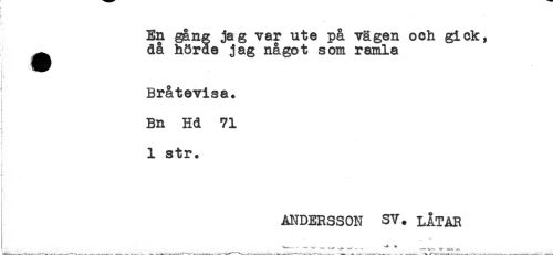 //// En gång jag var ute på vägen och gick, //// ^ då hörde jag något som ramla //// Bråtevisa. //// j //// Bn Hd 71 //// < //// : //// < //// i //// 1 str. //// ANDERSSON SV. LÅTAR //// -C*. ////