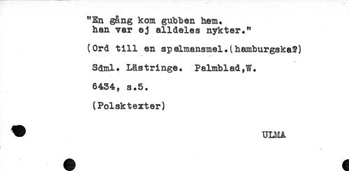 //// "En gång kom gubben hem. //// han var ej alldeles nykter." //// (Ord till en spelmansmel.(hamburgskaS?) //// ...i* * //// Sdml# Lästringe. Palmblad //// ' . < //// 64=34, s.5. //// (Polsktexter) ////