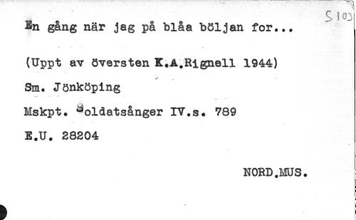 //// S t <u //// En gång när jag på blåa böljan for... //// (Uppt av översten K.A.Rignell 1944) //// -r //// Sm. Jönköping //// **-< . ** ---- //// Mskpt. ^oldatsånger IV. s. 789 //// E.U. 28204 ////
