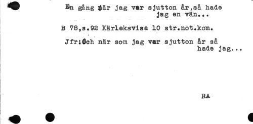 //// En gång &är jag var sjutton år,så hade //// jag en vän... //// B 78,s.92 Kärleksvisa 10 str.not.kom. //// ! A //// * //// Jfr:Och när som jag var sjutton år så //// hade jag... //// i //// i ////