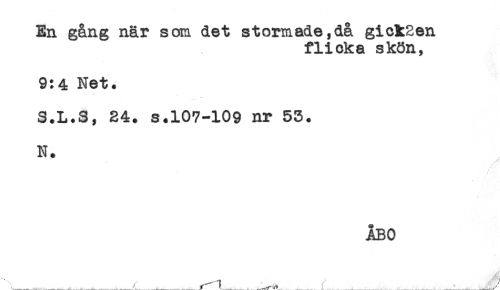 //// En gång när som det stormade,då gictSen //// flicka skön, //// 9:4 Net. //// S.L.S, 24. s.107-109 nr 53. //// N. ////
