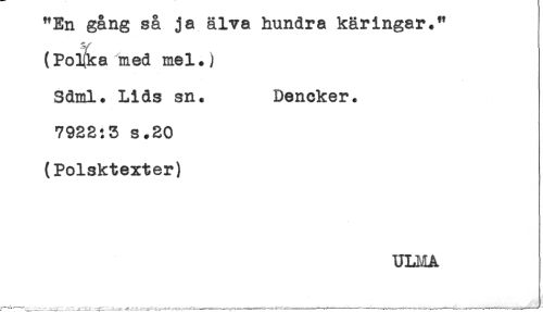 //// "En gång så ja älva hundra käringar." //// (Po^ka med mel.) //// Sdml. Lids sn. Dencker. //// 7922:3 s.20 //// (Polsktexter) //// ULMA //// --,____.___ _ j.. _ ..---.. r... - -----. -^-----^-'----- ////