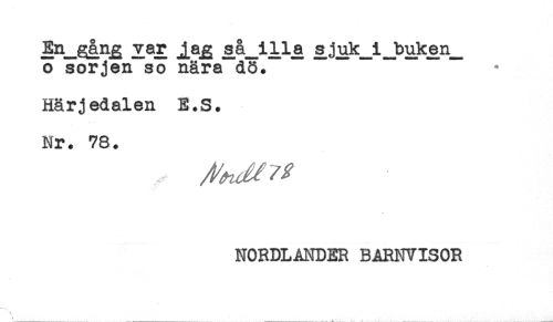 //// åR-gång var jag så_illa _s juk_i_buken_ //// o sorjen so nära dö. " //// Härjedalen E.S. //// Nr. 78. //// NORDLANDER BARNVISOR ////