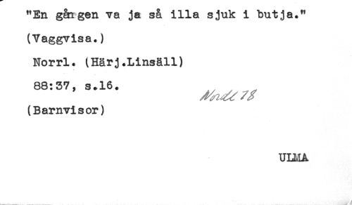 //// "En gången va ja så illa sjuk i butja." //// (Vaggvisa.) //// Norrl. (Härj.Linsäll) //// 88:57, s.16. ^ , ^ //// (B ar nvi s or) //// ULMA //// ...____ _____ . ^ ////