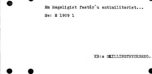 //// En Hagaligist festår'u antimilitarist... //// Se: E 1909 1 //// i //// * //// KB:s SKILLINGTRYCKSREG. ////
