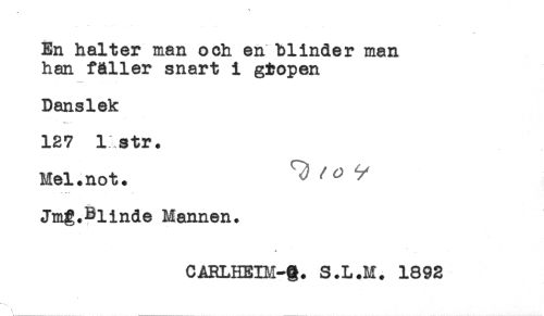 //// \ //// En halter man och en blinder man //// han fäller snart i gropen //// Danslek //// 127 1 atr. //// Mel.not. / ^ y //// - - . //// Jmg.Blinde Mannen. //// CAKLHEIM-e. S.L.M. 1892 ////