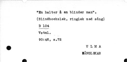 //// ^En halter å en blinder man". //// ... . //// (Blindbockslek, ringlek med sång) //// D 104 //// Vstml. //// ** //// 90:46, s.72 //// HÅNGLIKAR ////