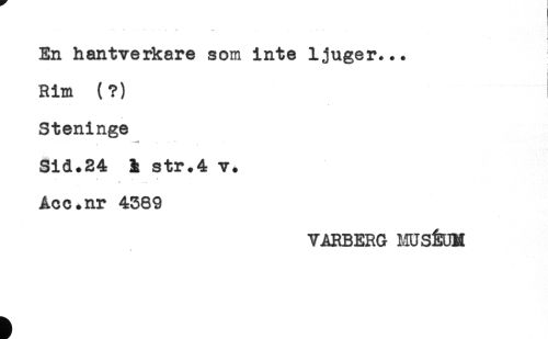 //// - . .. ^ . - . . . . ... //// En hantverkare som inte ljuger... //// Rim (?) //// Steninge //// .-* //// Sid.24 i str.4= v. //// y . * //// t - s- //// Åcc.nr 4369 //// VARBERG HUSÉUM ////