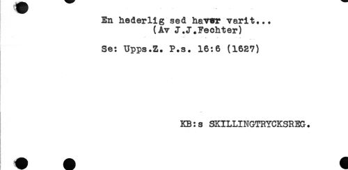 //// En hederlig sed havwr varit... //// (Av J.J^Fechter) //// - * r t //// ..... //// Se: Upps.Z. P.s. 16:6 (1627) //// KB:s SKILLINGTRYCKSREG. ////