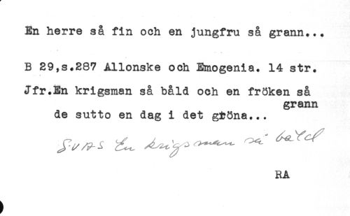 //// En herre så fin och en jungfru så grann... //// * //// * ^ //// B 29,s.287 Allonske och Emogenia. 14 str. //// Jfr.En krigsman så båld och en fröken så //// grann //// de sutto en dag i det gtöna... ////