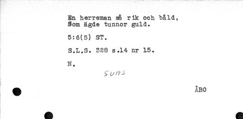 //// En herreman så rik och båld, //// Som ägde tunnor guld. //// \ //// 5:6(5) ST. //// S.L.S. 528 s.14 nr 15. //// N. //// * ÅBO ////