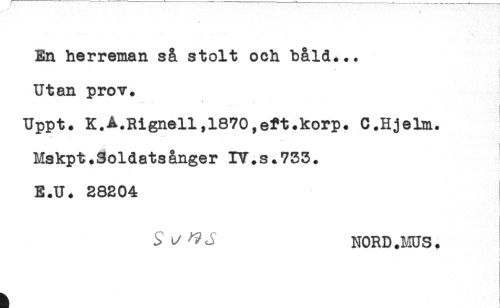 //// ! //// ! //// < //// Utan prov. //// Uppt. K.A.Rignell,1870,eft.korp. C.Hjelm. //// Mskpt.Soldatsånger IV.s.733. //// E.U. 28204 //// S* L/ ^ j NORD .MUS. //// i //// I //// i ////