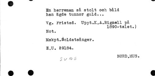 //// Vg. Fristad. Uppt.K.A.Rignell på //// 1890-talet.) //// Not. //// ... //// Mskpt.Soldats&nger. //// E.U. 29184. //// „ ^ NORD.MUS. //// ^ t //// /
