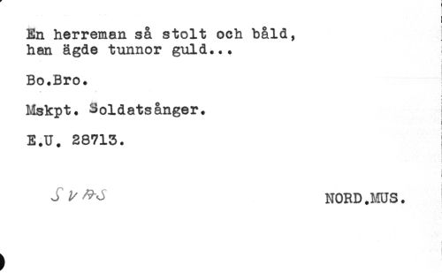 //// r //// f //// ! //// ) //// En herreman så stolt och båld, //// han ägde tunnor guld... //// Bo.Bro. //// - ' . = //// ) //// Mskpt. Soldatsånger. //// E.U. 28713. //// ! //// ^ ^ ^ NORD .MUS. ////