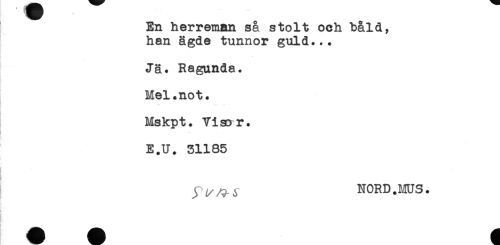 //// En herreman sa stolt och bald, //// han ägde tunnor guld... //// Jä. Ragunda. //// Mel.not. //// Mskpt. Visor. //// E.U. 31185 //// 3 M/^y NORD.HUS. ////