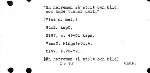 //// "En herreman så stolt och båld, //// som ägde tunnor guld." //// (Visa m. mel.) //// Sdml. Aspö, //// 2197, s+ 49-51 kaps. //// Vansö. Ringström,A. //// ! //// 2197, s.76-79. //// $Bn herreman så stolt och båld) //// ^ L/ 9 ULMA. ////