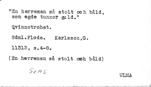 //// "En herreman så stolt och båld, //// som egde tunnor gild." //// Qvinnotrohet. //// Sdml.Flöda. Karlsson,G. //// 11513, s.4-8. //// (En herreman så stolt ocoh båld) //// ULMA ////