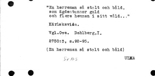 //// "En herreman så stolt och båld, //// som ägdentunnor guld //// och flera hemman i sitt våld..." //// Kärleksviåa. //// Vgl* Ova. Dahlb er g,I. //// i //// % * ? * //// 2750:5, s.92-95. //// (En herreman så stolt och båld) //// ULMA ////