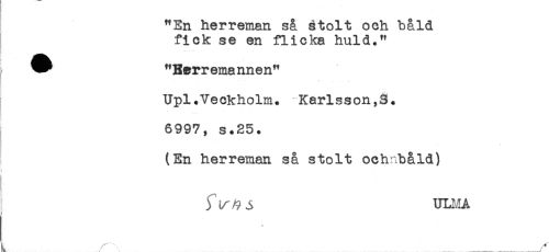 //// "En herreman så stolt och båld //// fick se en flicka huld." //// j * "Herremannen" //// Upl.Veckholm. Karlsson. //// 6997, s.25. //// (En herreman så stolt ochnbåld) //// t //// ) ^ % ^ ULMA //// ), ____ .. ////