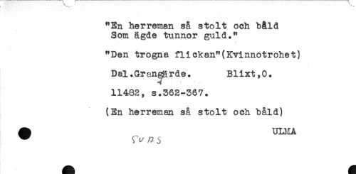 //// "En herreman så stolt och båld //// Som ägde tunnor guld." //// ;. * . -. //// "Den trogna flickan"(Kvinnotrohet) //// Dal.Grangärde. Blixt,0. //// 11482, s.362-367. //// (En herreman så stolt och båld) //// ^ ULMA //// ^ ff/23 ////