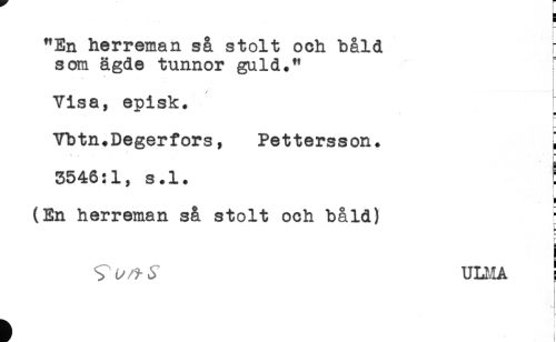 //// "En herreman så stolt och båld //// som ägde tunnor guld." //// * //// ! //// Visa, episk. ** //// Vbtn.Degerfors, Pettersson. ^ //// ^ - //// t //// 5546:1, s.l. [ //// L //// ! //// (En herreman så stolt och båld) j* //// i //// r //// i //// uniA ! //// t- ////