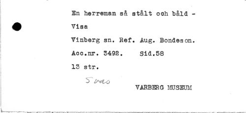 //// En herreman så stålt och båld - //// i //// j //// ^ Visa //// ] Vinberg sn. Ref. Ang. Bondeson. //// Acc.nr. 3492. Sid.58 //// : //// 13 str. //// i //// b //// i VARBER G MUSEUM //// . ^^^ ^.._ _ ^ .....^ ^ _____ ___ ////