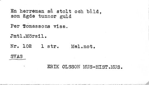 //// En herreman så stolt och bald, i //// som ägde tunnor guld //// + //// Per Tomassons visa. //// Jmtl.Mörsil. //// Nr. 102 1 str. Mel.not. //// SVAS //// ERIK OLSSON MUS-HlST.MUS. ////