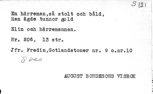//// En härreman,så stolt och båld, //// Han ägde tunnor gild i //// Elin oeh härremannen. //// - //// ^ * - //// t //// Nr. 206, 13 str. //// r //// Jfr. Frödin,Gotlandstoner nr. 9 o.nr.10 //// i //// t //// ) //// AUGUST BONDESONS VISBOK //// c //// t t ////