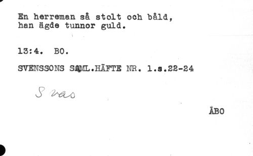 //// En herreman sa stolt och båld, //// han ägde tunnor guld. //// 13:4. BO. //// SVENSSONS S#IL.HÄFTE NR. l.s.23-24 //// O //// ÅBO ////