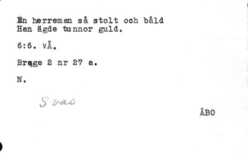 //// ) //// t //// En herreman så stolt och båld //// Han ägde tunnor guld. //// 6:6. vÅ. //// Brqge 2 nr 27 a. //// N. //// ÅBO ////