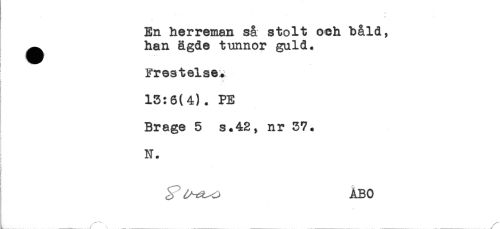 //// En herreman så stolt och båld, //// ^ han ägde tunnor guld. //// t*'***^ - -A* - ^ . //// C JL 133* U CJLS15 + //// i //// 13:6(4). PE //// Brage 5 s.42, nr 37. //// N. //// ! //// . //// ^ ÅBO ////