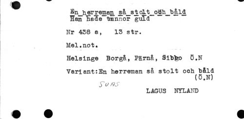 //// En herreman s^a^s/t cl å M //// Ean hade tmnnor guld //// A t-* //// Nr 438 a, 13 str. //// Mel.not. //// Helsinge Borgå, Pärnå, Sib^o 8.N //// Yariant:En herreman så stolt och båld //// (C.N) //// LAGUS NYLAI7D ////