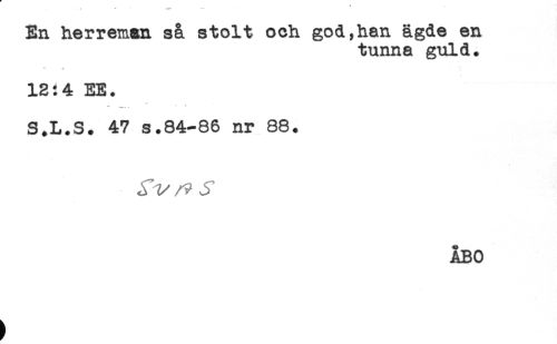 //// --- - //// En herreman så stolt och god,han ägde en //// tunna guld. //// ** //// 12:4 EE. //// S.L.S. 47 s.84-86 nr 88. //// ÅBO ////