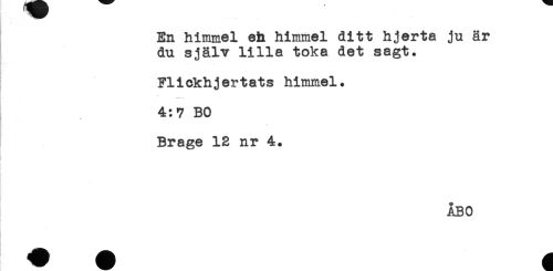 //// En himmel eh himmel ditt hjerta ju är //// du själv lilla toka det sagt. //// Flickhjertats himmel. //// 4:7 BO //// Brage 12 nr 4. //// ÅBO ////