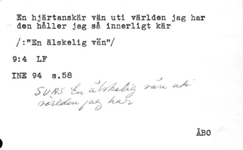 //// En hjärtanskär vän uti världen jag har //// den håller jag så innerligt kär //// /:"En älskelig van" //// /9:4= LF //// INE 94 s.58 //// ÅBO ////