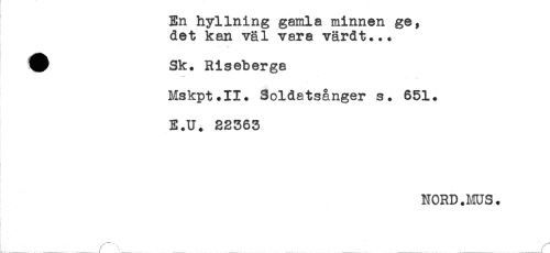 //// En hyllning gamla minnen ge, //// det kan väl vara värdt... //// ^ Sk. Riseberga //// Mskpt.II. Soldstsånger s. 651. //// E.U. 22363 //// NORD.MUS. ////