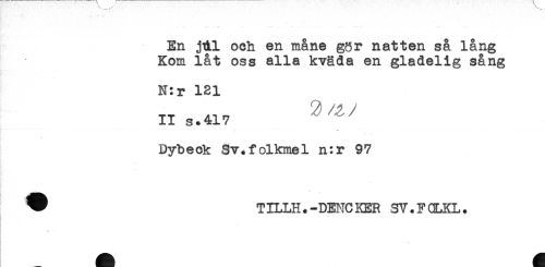 //// V X. //// En j^l och en måne gör natten så lång //// Kom låt oss alla kväda en gladelig sång //// N:r 121 //// TT A1H //// II s.417 //// ^ __ .v //// Dybeck Sv.folkmel n:r 97 //// * TILLH.-DENCKER SV.FGLKL. ////