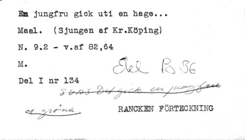 //// Em jungfru gick uti en hage... //// Maal. (Sjungen af Kr .Köping) //// N. 9.2 - v.af 82,64 //// Del I nr 134 //// RANCKEN FÖRTECKNING //// - . . . .. f--*"*)***".. . f .......- ////