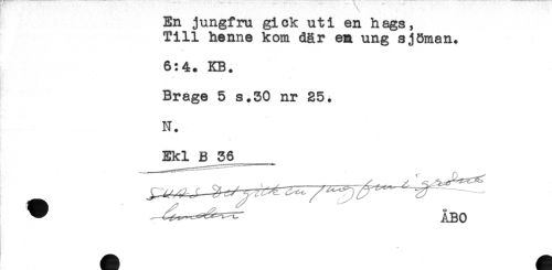 //// \ //// En jungfru gick uti en hags, //// Till henne kom där em ung sjöman. //// 6:4. KB. //// Brage 5 s.30 nr 25. //// N. //// Ekl B 36 //// ___- n<« -'-""'StmtMWMW*^**^* ////