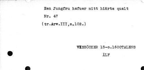 //// Een Jungfru hafuer mitt hiärta qualt //// Nr. 47 //// j. * ^ -- //// (tr.Arw.III,s.l02.) //// [ ' //// ^ t ' //// VISBOCKER 15-o.16OOTALENS //// # ALF ////