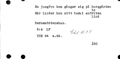 //// En jungfru hon gångar sig på borggården //// in //// där lindar hon sitt barn i snövitan //// lind //// ! //// Barnamörderskan. //// 6:4 LF ^ , ^ //// INE 94 s.42. //// ÅBO ////