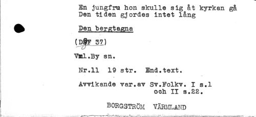 //// En jungfru hon skulle sig åt kyrkan gå //// Den tiden gjordes intet lång //// ^^ Den beratagna //// (D§F 37) //// Vml.By sn. //// I Nr.11 19 str. End.text. //// - //// Avvikande var.av Sv.Folkv. I s.l //// och II s.22. //// BORGSTRÖM VÄRIvILAND ////
